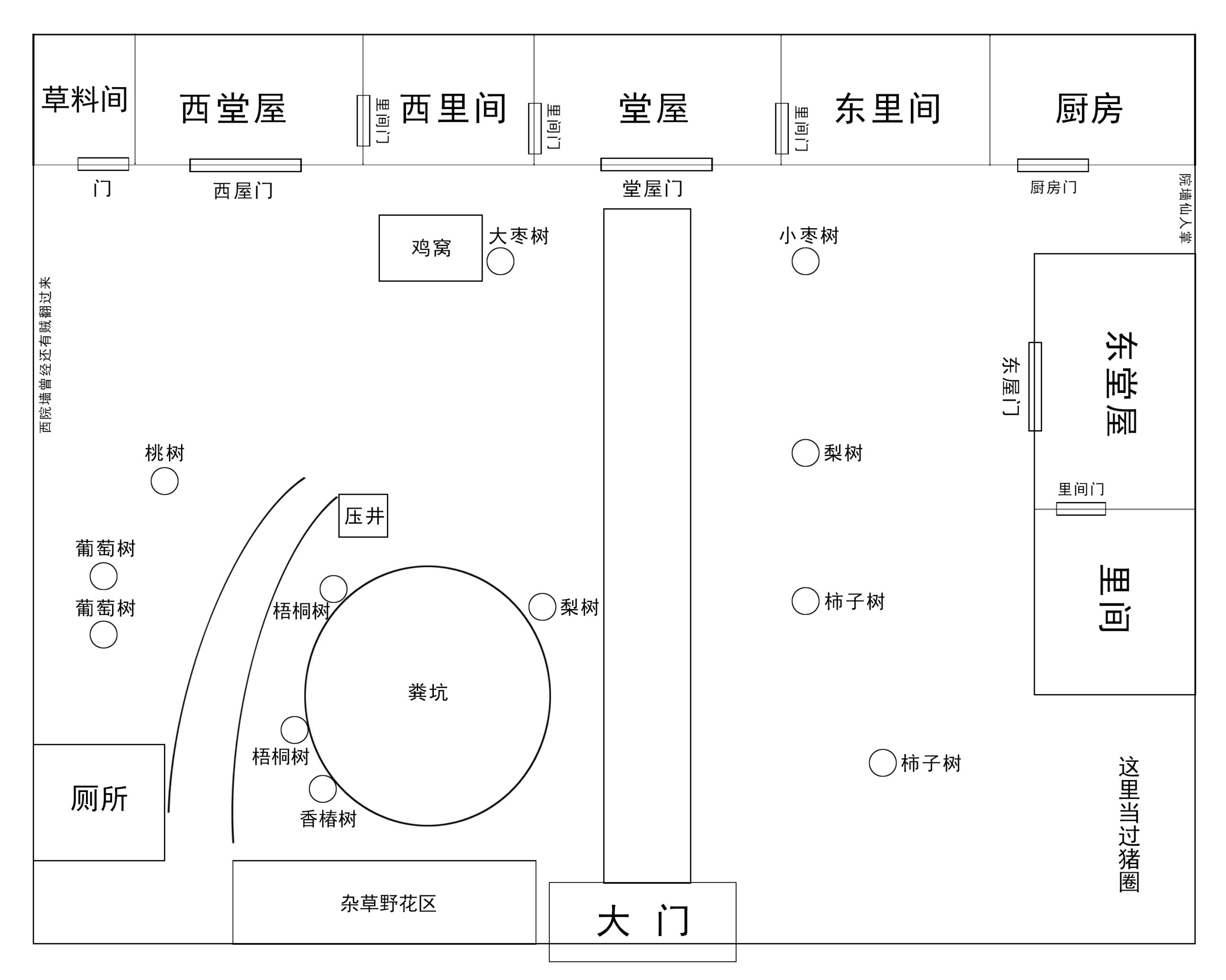 院子最西南是厕所,厕所北边有两棵葡萄树,还有一棵桃树,厕所往东边来,围着粪坑的西边还有两棵梧桐树,靠着粪坑的西北角是我们家的压井,那时候农村的家家户户都有压井,这样可以满足平常老百姓一家人的饮水,还有平日里的洗洗涮涮。